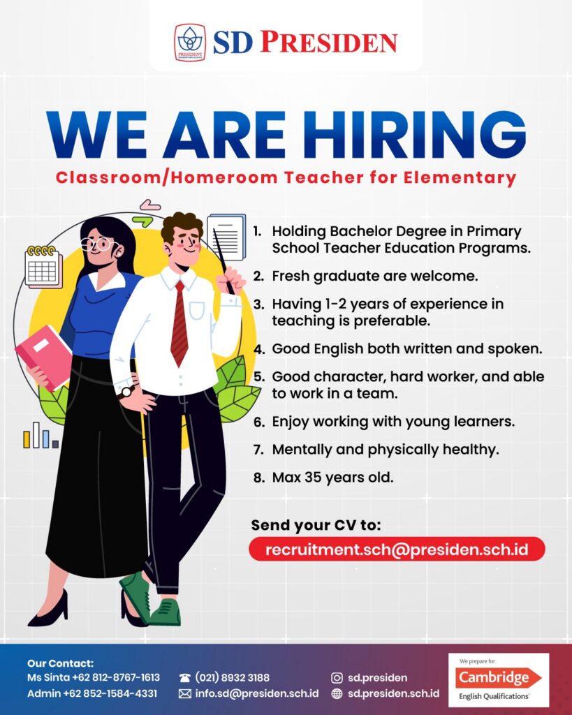 Job Description : Will teach all subjects, Responsible as homeroom teacher in the classroom, Perform classroom administration efficiently, Actively teach and observe student development